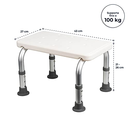 Gradino per vasca da bagno piccolo e compatto: il gradino per doccia nelle dimensioni più compatte (gambe al livello più basso) misura 43 x 27 x 21 cm. In questo modo il piccolo gradino è facile da riporre e non intralcia il passaggio. Grazie alle gambe leggere in alluminio, il supporto di ausilio per anziani è facilmente trasportabile.