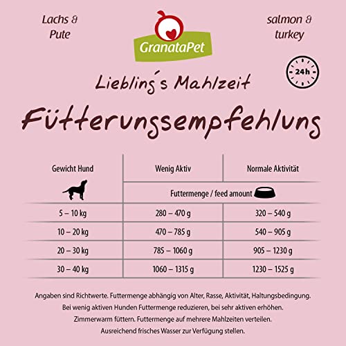 GranataPet Liebling's Mahlzeit salmone e tacchino, cibo per cani, cibo umido per cani, scatolette per cani senza cereali e zuccheri aggiunti, alimento cani completo, 6 x 400 g