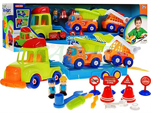 DOTAZIONE KIT: - camion di grandi dimensioni, con una barra di traino, - bulldozer in movimento con un cucchiaio, - ribaltabile con lo spostamento degustatore, - 2 campanelli d'allarme, - quattro caratteri. - figurina di un poliziotto, - la figura costruttore, - cacciavite con punte intercambiabili (piatta e asterisco) - piatto chiave chiave, - set di viti .