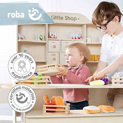 Roba Grande Negozio Giocattolo per Bambini - con Mensole e 6 Cassetti - Accessori Inclusi - Stand Vendita con 2 Piani di Lavoro - Legno assiccio Naturale