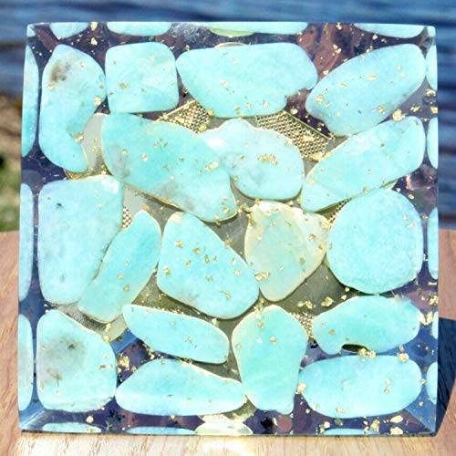 Grande piramide di orgonite nubiana fatta a mano, con cristalli, ametista, iolite, amazzonite e oro frutta della vita