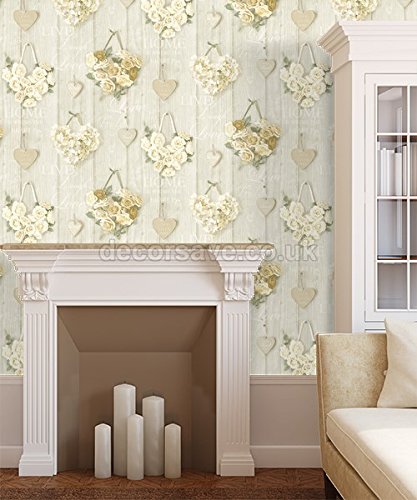 Grandeco - Carta da parati, motivo floreale con bouquet di fiori di rosa con forma di cuore, effetto legno, Standard - liscio e morbido, Cream A14501, 10 m