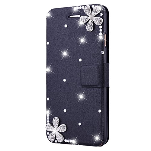 GrandEver Borsa in Pelle Cover per iPhone 6 6S 4.7", Morbida PU Libro 3D Cristallo Bling Strass Cuoio Portafoglio Flip Leather Case per Carte di Credito, Protettiva Stand Caso Chiusura Magnetica Custodia con Diamond + Universale Stilo Capacitivo - Fiori Nera