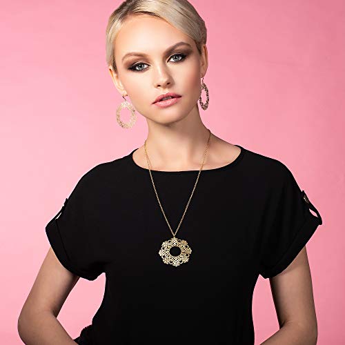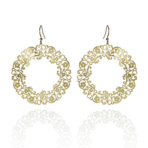 Eleganti orecchini grandi per donna con intricati dettagli floreali. Orecchini pendenti rotondi color oro con elegante finitura graffiata