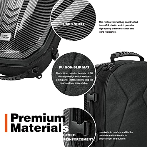 【Materiale di alta qualità】 - Coperchio superiore in ABS rigido modellato con un design "simile al carbonio", la borsa posteriore della moto mantiene la sua forma anche quando è vuota, il corpo è realizzato in tessuto Oxford impermeabile e il fondo è realizzato in resistente pelle PU strutturata pad antiscivolo per un maggiore attrito e protezione della vernice senza graffi.
