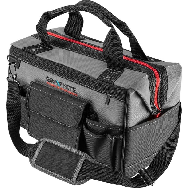 Borsa per elettroutensili Energy+ Medium Graphite. 18,5L, 15 tasche. GTO 58G092 La borsa per elettroutensili Energy+ Medium del brand GRAPHITE ha una capienza di 18,5n litri ed è realizzata in poliestere resistente e impermeabile. .Manici e tracolla regolabile Tasche: 15 di cui tasche interne: 8 tasche esterne: 7 Nr 2 nastri per fissare internamente gli elettroutensili Peso: 2kg N
