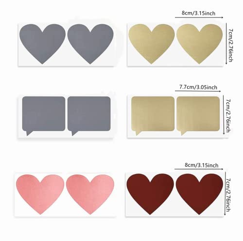 La confezione include: un totale di 60 adesivi antigraffio. 10 pezzi d'argento a forma di cuore, 10 pezzi d'argento a forma di dialogo, 10 pezzi d'argento a forma di tondo, 10 pezzi d'oro a forma di cuore, 10 pezzi d'oro a forma di cuore e 10 pezzi di rosso a forma di cuore quattro colori adatti a diverse occasioni e usi.