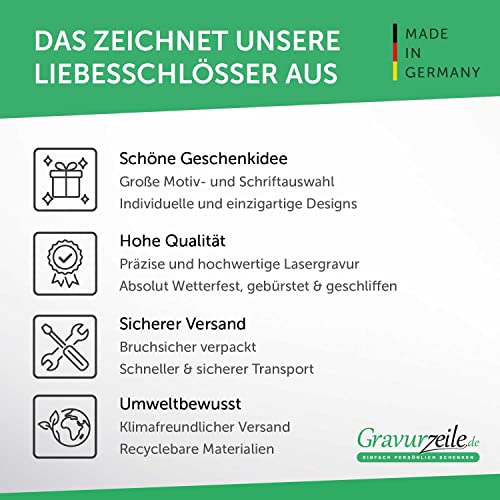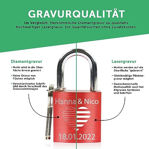 Incisione perfetta:Il colore dell'amore si unisce all'incisione con punta diamanta su una cosa preziosa:il nostro lucchetto dell'amore! Il tuo regalo per una persona speciale.Un breve messaggio con i vostri nomi incisi per il vostro anniversario trasforma un lucchetto di colore rosso in una prova e in un regalo d'amore.