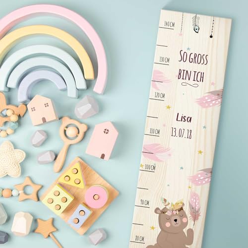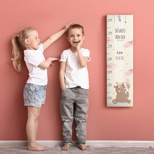 GRAVURZEILE Metro per bambini in legno - Teddy Rosa Design - con nome per cameretta dei bambini - Scala misura 80 - 140 cm - Dimensioni 20 x 70 x 2 cm - Regalo per nascita per ragazze e ragazzi