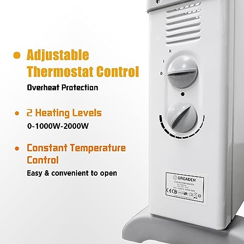 GREADEN Stufa Elettrica 2000W Termoconvettore Elettrico Mobile con Termostato casa Stufetta Elettrica Basso Consumo Riscaldamento a 2 livelli con Protezione dal Surriscaldamento + Bassa Rumorosità