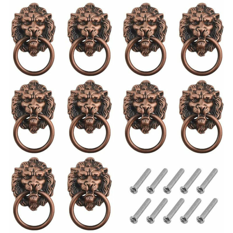 Set di 10 - Confezione di 10 maniglie a testa di leone in bronzo rosso (40 x 67 mm) con viti incluse per una facile installazione. 【Aspetto speciale】 Il design unico a forma di testa di leone retrò conferisce ai tuoi mobili un aspetto unico. 【Alta qualità】 Il il manico della testa di leone è realizzato in lega di zinco di alta qualità, che è stabile e durevole, non facile da arrugginire o sbiadire. 【Ampiamente applicabile】 Utilizzato in tutti tipi di mobili, come armadi, cassetti, cassettiere, porte, ecc.