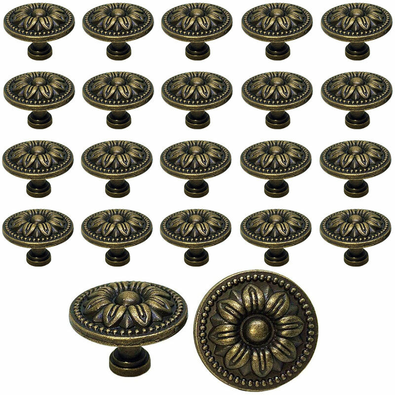 Materiale: lega di zinco Diametro: 35 mm Altezza: 26 mm Fornisce 20 pomelli per cassetti con viti. Si adatta alla maggior parte dei pannelli delle ante fino a 0,9 pollici/22 mm di spessore. La maniglia rotonda dell'anta dell'armadio con un bellissimo motivo floreale è delicata e pratica. Decora perfettamente qualsiasi armadio, comò, scrivania, scarpiera, cassetto e altro ancora.