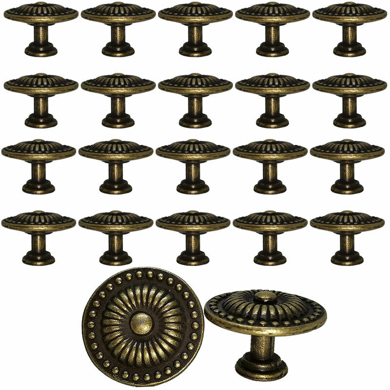 Materiale: lega di zinco Diametro: 29 mm Altezza: 20 mm Fornisce 20 pomelli per cassetti con viti. Si adatta alla maggior parte dei pannelli delle ante fino a 0,9 pollici/22 mm di spessore. La maniglia rotonda dell'anta dell'armadio con un bellissimo motivo floreale è delicata e pratica. Decora perfettamente qualsiasi armadio, comò, scrivania, scarpiera, cassetto e altro ancora.