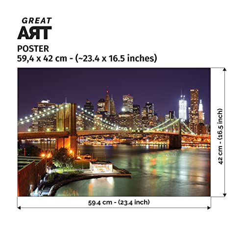 GREAT ART® Poster - Ponte di Brooklyn - Grattacieli Incandescenti Notte New York Skyline Manhattan Bridge Grande Mela Big Apple Decorazione da Parete Murale Din A2 (42 x 59,4 cm)