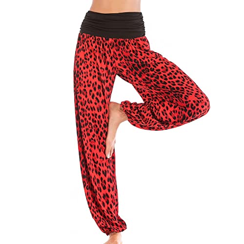 Grebest Donne Blocchi Di Colore Stampa Leopardo Vita Alta Caviglia Legato Yoga Pantaloni Sportivi Rosso S