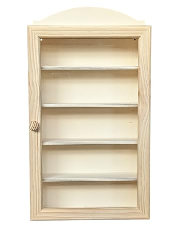Vetrina da collezione. In legno di pino grezzo, da decorare. Si compone di 5 ripiani, ideale per collezionare diversi oggetti, ditali, miniature, ecc... Con porta in metacrilato trasparente (rimuovere pellicola protettiva). Coppetto decorativo sulla parte superiore. Misure esterne (larghezza/profondità/altezza): 25 x 8,5 x 44 cm. Distanza tra le piastrelle: 6,7 cm. Ripiani fissi. Dimensioni interne: 22,4 x 6,5 cm
