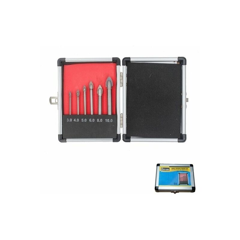Set composto da 6 punte ideali per forare vetro, specchio, porcellana e terracotta. Podotto fornito in custodia di alluminio.