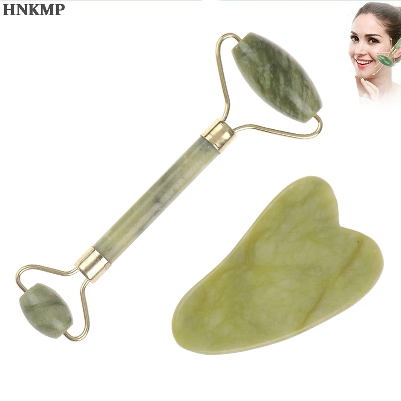 2 in 1 Green Roller and Gua Sha Tools Set by Natural Jade Scraper Massager Eye Face Neck Thin Lift Relax Slimming Tool