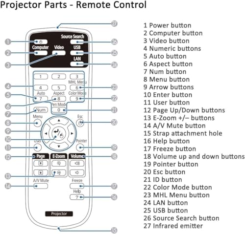 Adatto per Epson EB-97 EB-98 EB-940 EB-945 EB-950W EB-955W EB-965 EB-S03 EB-S17 EB-S18 EB-S21 EB-S120 EB-S200 EB-W03 EB-W18 EB-W22 EB-B-W22 EB-B-B-W120 EB-X03 EB-X18 EB-X20 EB-X21 EB-X22 EB-X24 EB-X25 EB-X120 EB-X200 EH-TW490 EX3220 EX5220 EX5230 EX6220 EX7220 VS220 30 VS3. Telecomando di ricambio per proiettore 30 VS335W