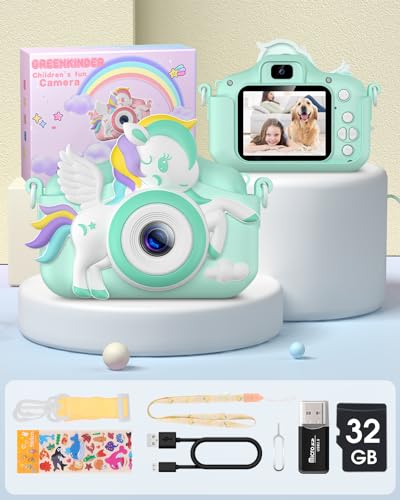 GREENKINDER Macchina Fotografica Bambini, 2.0 Pollici Mini Ricaricabile Fotocamera Digitale 1080P HD Videocamera con Scheda 32GB, Regali Giocattolo di Natale & Compleanno per Ragazze 3-12 Anni