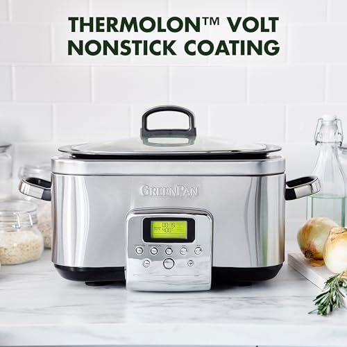 GreenPan Elite 8-in-1 Slow Cooker programmabile da 6L,coperchio lavabile in lavastoviglie e vassoio rimovibile, ceramica sana senza PFAS antiaderente, cottura,soffritto,cestello a vapore,arrosto,inox