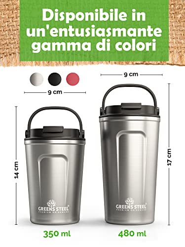 Greens Steel Tazza Termica Riutilizzabile - 480ml, Argento I Tazza da Viaggio con Tappo e Maniglia I Termos Bevande Calde e Fredde in Acciaio Inox I Mug Ermetica Tè Caffè Bibite Ghiacciate I Senza BPA
