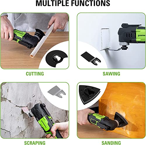 【 Include 】 Strumento di oscillazione Greenworks, Trapano avvitatore, 9 × carta vetrata triangolare, 1 × base triangolare in carta vetrata, 1 × lame, 1 × lame per raschietto, 1 × sega semicircolare multiuso, Batterie 2Ah, batteria agli ioni di litio, 1 caricatore ora