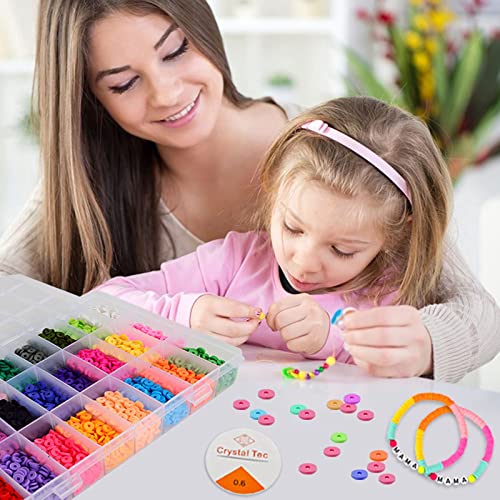 GreeSuit - Perline per collane in argilla polimerica, per gioielli, bracciali, regalo per bambini, 24 colori vivaci, piatti rotondi con ciondolo corde elastiche per gioielli fai da te creazione