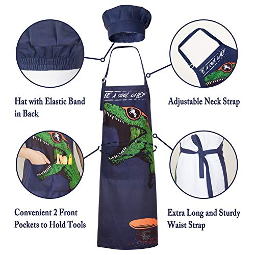 MHJY Grembiule per bambini con cappello da cuoco, grembiule con dinosauro per bambini con cinturino regolabile, 2 tasche, grembiule per bambini e ragazzi, per la cottura e la pittura, Blu scuro, S