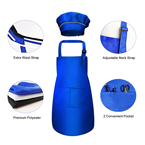3 Set Grembiule per Bambini e Cappello da Cuoco, Grembiule per Bambini con Tasca, Regolabile Grembiule per Ragazzo Ragazza Cucinare, Pittura, Regali di Festa (4-15 Anni, Nero + Bianco + Blu)