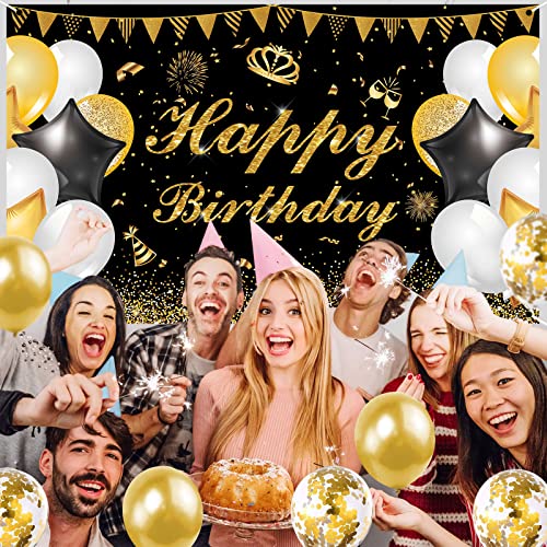 GRESAHOM Banner di Buon Compleanno Decorazioni, Striscione di Compleanno Oro Nero, Extra Grande Tessuto Compleanno Banner Sfondo con Palloncini, Decorazioni di Compleanno Festa Compleanno Decorazioni