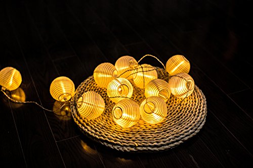 20 lanterne rotonde di diversi colori/bianche in nylon, distanza tra due è 25cm (0,8ft), lunghezza del cavo 5m (16,4ft).