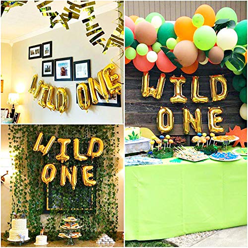 Imballaggio - Compresi palloncini WILD ONE da 16 pollici in lamina doro, 5 palloncini con lamine di animali (leone, tigre, giraffa, scimmia, zebra), palloncini in lattice da 12 pezzi da 12 pollici (6 verde e 6 bianchi), foglie di palma artificiali da 12 pezzi 12 pollici.
