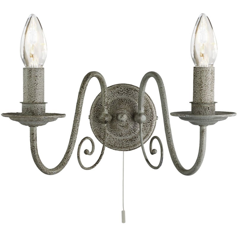 Collezione Greythorne CONTRASTO DI STILE Questa staffa da parete Greythorne a 2 luci ha una finitura grigia testurizzata rustica che contrasta con l'aspetto altrimenti elegante. Due bracci tradizionali sono completi di candele a vista. C'è un interruttore a tirante bianco nella parte inferiore della base rotonda. Utilizzalo nei corridoi per accogliere i tuoi ospiti a casa tua.