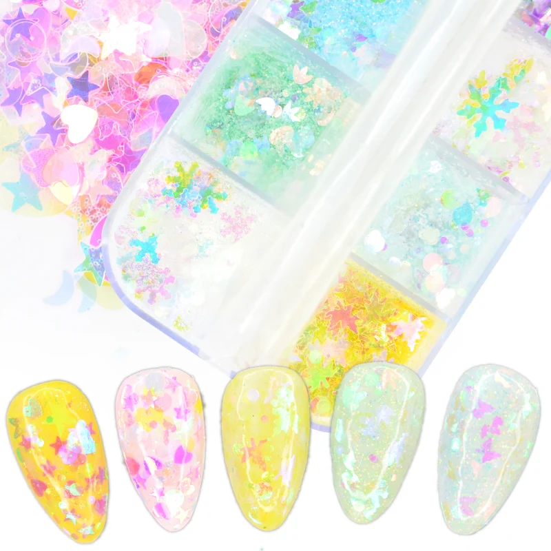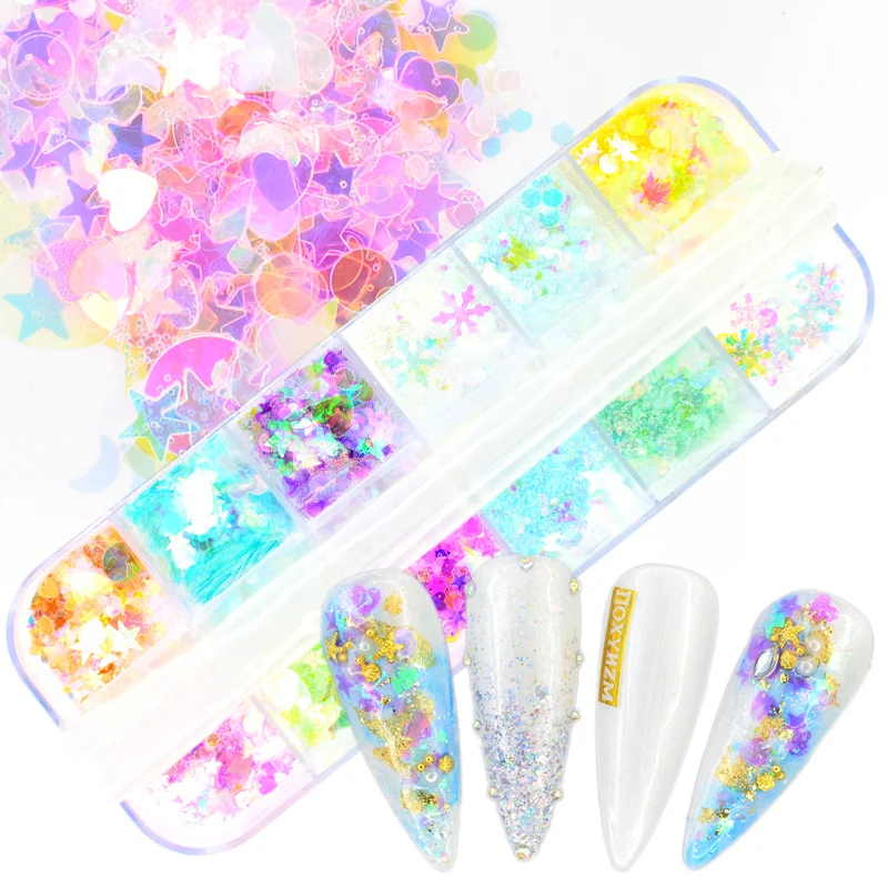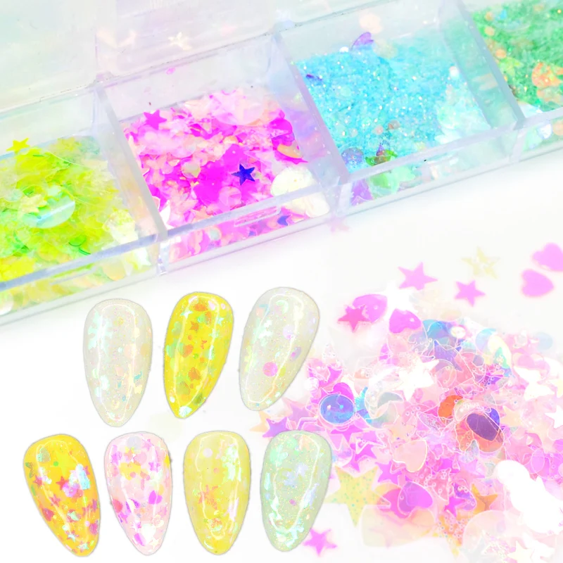 12 Grids Colorful Acrylic Sequins Flakes Nail Mirror Sparkly Paillette Glitter Hexagon Round Mixed Nail Art Decoration
