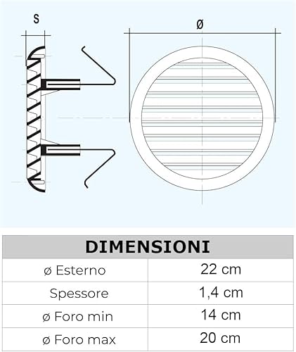 ✅ Dimensioni esterne: 22 cm, Spessore 1,4 cm, Foro minimo da 14 cm, Foro massimo da 20 cm