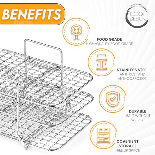 【 ACCIAIO INOSSIDABILE DI ALTA QUALITÀ】 Il ripiano a 3 livelli della friggitrice ad aria è realizzato in acciaio inossidabile 304 per uso alimentare di alta qualità, che è sicuro e durevole e previene l'ossidazione e la corrosione causate dall'ambiente esterno.