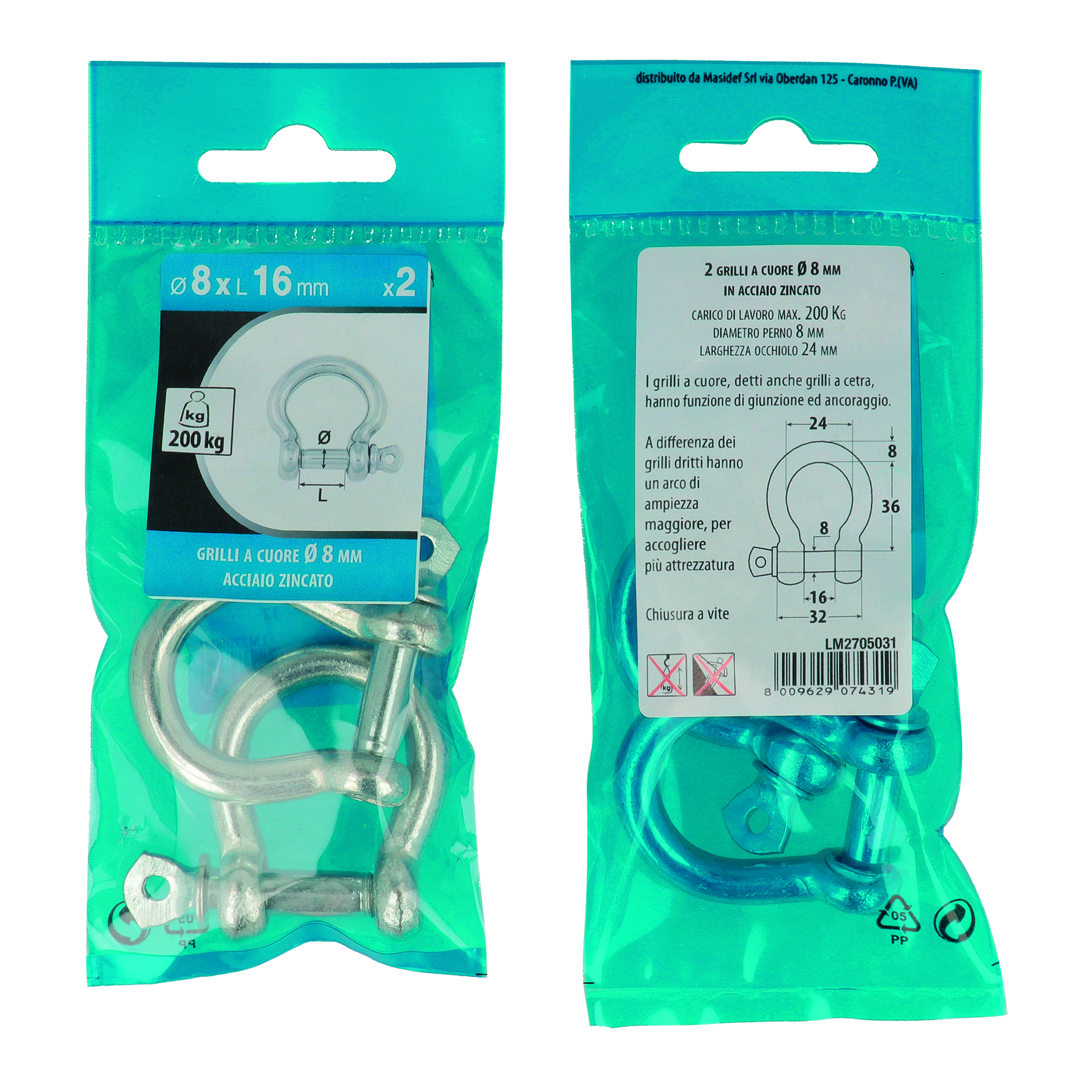 2 grilli a cuore Ø 8 mm. in acciaio zincato, carico di lavoro max. 200 Kg. diametro perno 8 mm. larghezza occhiolo 24 mm. I grilli a cuore, detti anche grilli a cetra, hanno funzione di giunzione ed ancoraggio. A differenza dei grilli dritti hanno un arco di ampiezza maggiore, per accogliere più attrezzatura. Chiusura a vite. Non adatti per arrampicata e sollevamento