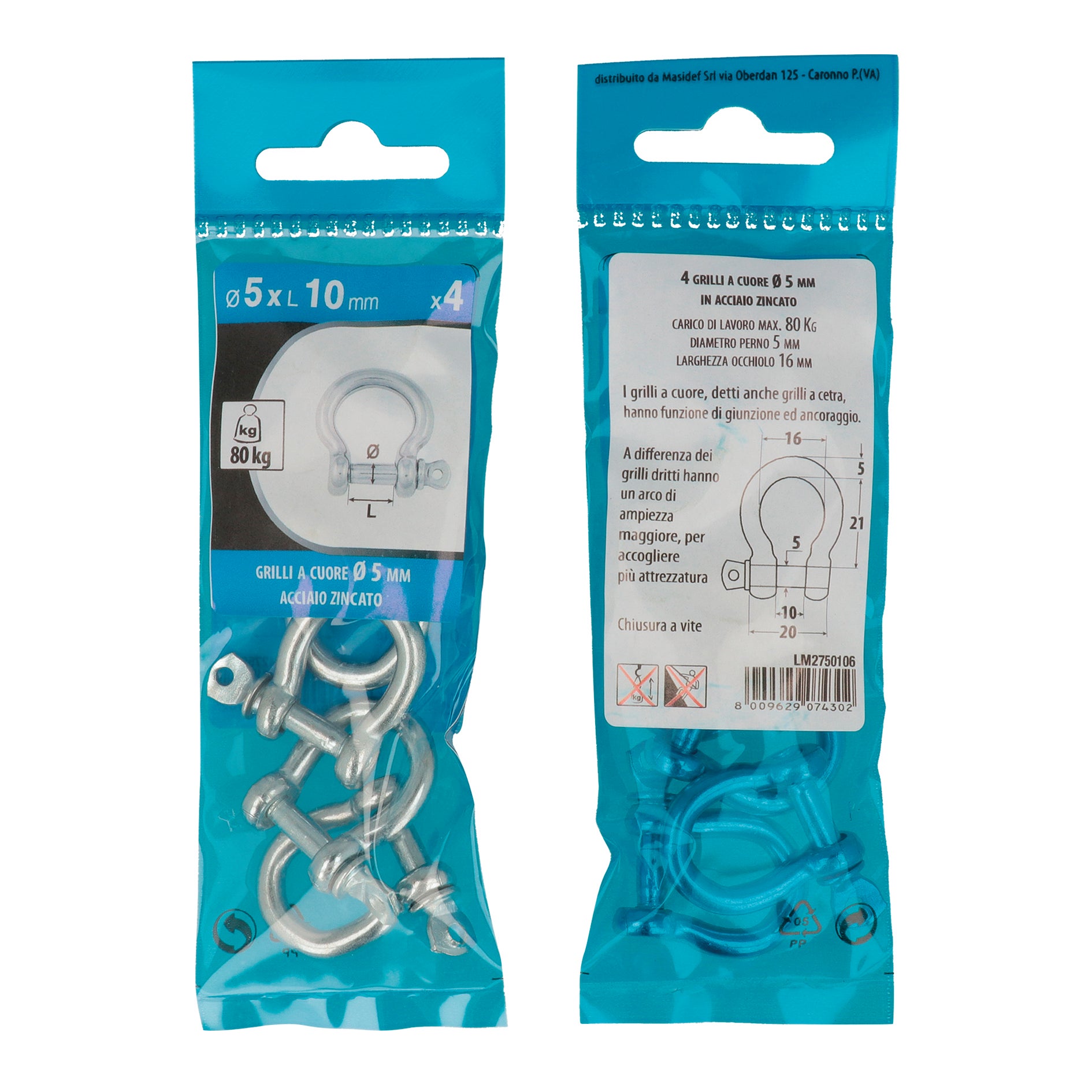 4 grilli a cuore Ø 5 mm. in acciaio zincato, carico di lavoro max. 80 Kg. diametro perno 5 mm. larghezza occhiolo 16 mm. I grilli a cuore, detti anche grilli a cetra, hanno funzione di giunzione ed ancoraggio. A differenza dei grilli dritti hanno un arco di ampiezza maggiore, per accogliere più attrezzatura. Chiusura a vite. Non adatti per arrampicata e sollevamento