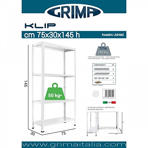 GRIMA - SCAFFALE in metallo BIANCO 75 X 30 X 145h 4 Ripiani Portata 200 Kg