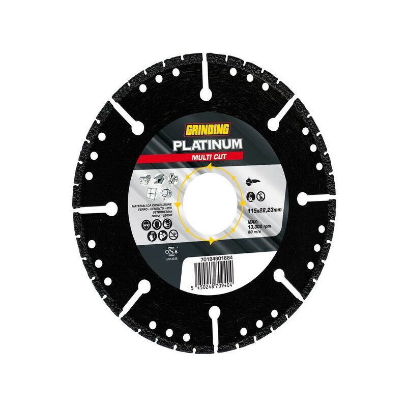 Grinding disco diamantato elettrodeosto platinum multi-cut � mm. 115x2,5x22,23 Corona con asole di sfogo, strato di diamante di alta qualit�. Per il taglio di materiali da costruzione, ghisa, ferro, cemento, PVC, vetroresina, legno. Articolo produttore: 70184601684