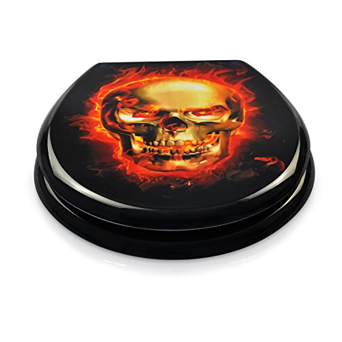 Grinscard, sedile per WC con meccanismo di abbassamento automatico, design “Burning Skull”, coperchio per WC di polimeri termoindurenti, con motivo, conset di montaggio