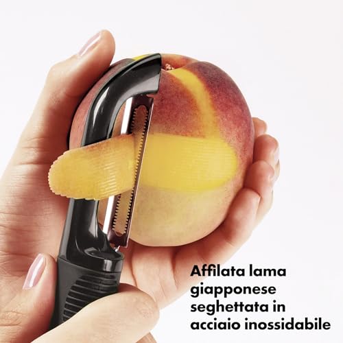 NESSUNA FATICA: sbuccia grandi quantità di frutta e verdura con il pela frutta e verdura dentellato, dotato di un'impugnatura morbida, confortevole e antiscivolo, che assorbe la pressione durante il movimento ripetitivo di pelatura