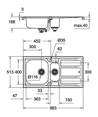GROHE K400+ | 1 vasca e mezzo | Lavello da cucina - sopratop, reversibile | include: piletta automatica, set tubi di scarico, sifone, set di installazione| Acciaio inox | 31569SD0