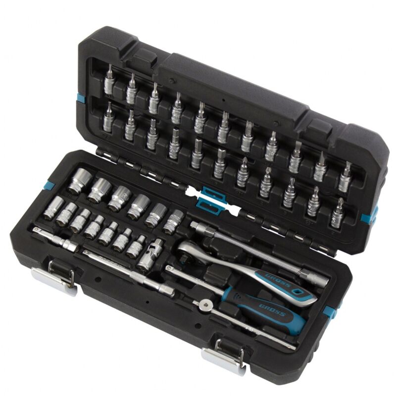 GROSS - Set di attrezzi multiuso con chiave a cricchetto e cacciavite 1/4" - 42 pezzi Set di attrezzi multiuso versatile. 42 pezzi. Ideale per vari tipi di lavori: meccanica, montaggio, smontaggio... Multiuso Il set di attrezzi GROSS è appositamente progettato per la versatilità . Vi accompagnerà al meglio nei vostri lavori di montaggio, anche di costruzione o meccanica . Infatti include tutti gli strumenti necessari per questo tipo di operazioni. Alta qualità Il set propone strumenti e accessori di alta qualità, realizzati con materiali resistenti e durevoli per offrire all'utente la migliore esperienza possibile. Chiave a cricchetto • 1 chiave 1/4" La chiave a cricchetto è reversibile e dotata di un cricchetto a 120 denti, in acciaio al cromo vanadio. I 120 denti del meccanismo a cricchetto offrono una precisione e una scorrevolezza maggiori durante il serraggio, mentre il materiale utilizzato per la sua fabbricazione garantisce una grande resistenza all'usura e una maggiore