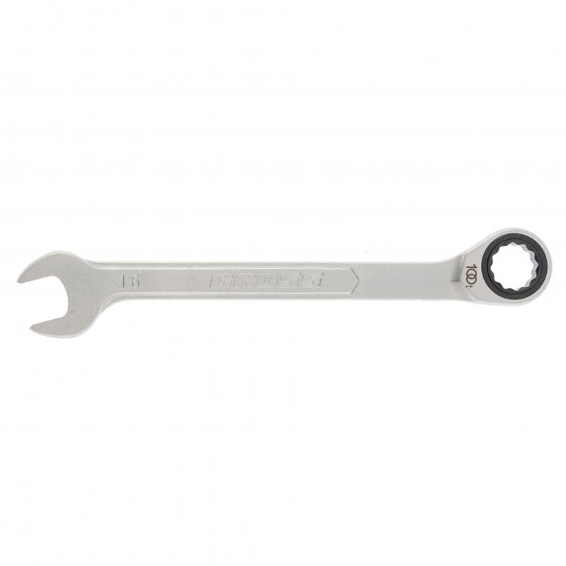 GROSS - Chiave combinata a cricchetto - 16 mm • 16 mm • Lato piatto • Lato a occhiello a 12 bordi a cricchetto • Acciaio di alta qualità • Resistente e affidabile Più di una semplice chiave La chiave combinata a cricchetto GROSS è progettata per lavori di montaggio/smontaggio, avvitatura/svitatura. Sarà particolarmente utile per operazioni di riparazione meccanica, installazione di mobili, ecc. Ha un lato tipo chiave piatta e un altro lato tipo chiave a occhiello, a cricchetto. Il cricchetto è un vero valore aggiunto rispetto a una chiave classica: consente di lavorare in modo più efficiente, più veloce e in spazi più ristretti. Qualità al top Realizzata con una politica di qualità, questa chiave utilizza materiali solidi: acciaio di alta qualità, e un rivestimento anticorrosione. Queste caratteristiche le permettono di resistere a forti sollecitazioni. Lo strumento è conforme allo standard tedesco DIN, garantendo la sua alta qualità e affidabilità. Comfort d'uso Il rivestimento