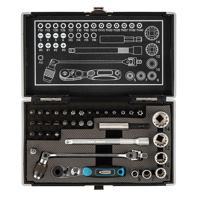 GROSS - Set chiavi a cricchetto, bussole e punte - 37 pezzi • Set versatile • 1 chiave a cricchetto • 26 punte • 6 bussole • 1 cardine • Prolunghe Un set completo e versatile Questo set GROSS è un set versatile che include tutto il necessario per svolgere piccoli lavori di montaggio / smontaggio: mobili, apparecchi elettrici, biciclette... Il kit comprende 32 punte e bussole delle dimensioni più comuni, una chiave a cricchetto, un prolunghe magnetico per punte, un cardine e un adattatore esagonale a quadrato. Chiave a cricchetto reversibile Punte e bussole La chiave magnetica garantisce un funzionamento efficiente anche in luoghi di difficile accesso senza rischio di caduta e perdita delle punte. Inoltre, dispone di un cricchetto reversibile che consente di avvitare e svitare. Ha un manico in gomma confortevole per una presa ottimale. Le punte e le bussole sono realizzate in acciaio giapponese di alta qualità e la loro testa in acciaio al cromo vanadio offre una resistenza all'usura
