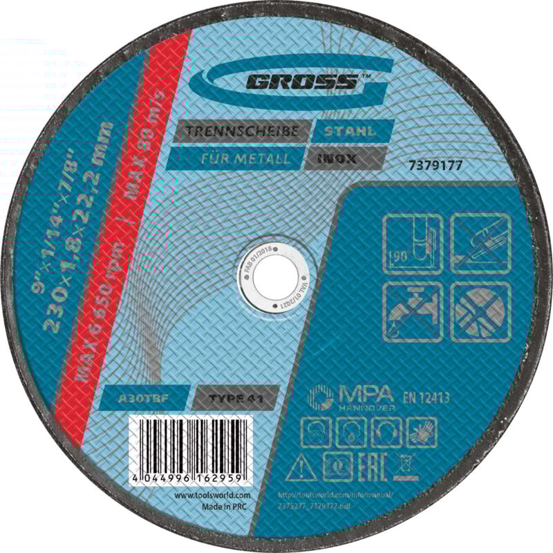 I dischi per taglio GROSS sono progettati per tagliare materiali metallici come acciaio, acciaio inossidabile, ecc... La loro progettazione consente un taglio netto ed efficiente ed è adatto anche per un uso professionale. Hanno un certificato di sicurezza internazionale di Hannover. Informazioni tecniche: - Diametro: 230 mm - Foro: 22,2 mm - Spessore: 1,8 mm