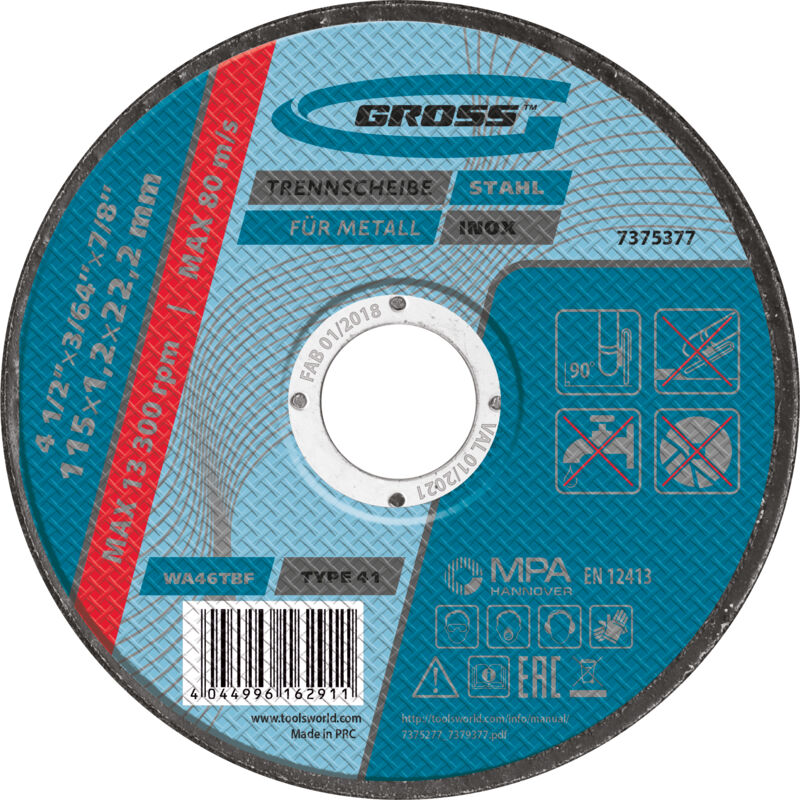I dischi per taglio GROSS sono progettati per tagliare materiali metallici come acciaio, acciaio inossidabile, ecc... La loro progettazione consente un taglio netto ed efficiente e sono adatti anche per un uso professionale. Sono dotati di un certificato di sicurezza internazionale di Hannover. Informazioni tecniche: - Diametro: 115 mm - Foro: 22,2 mm - Spessore: 1,2 mm