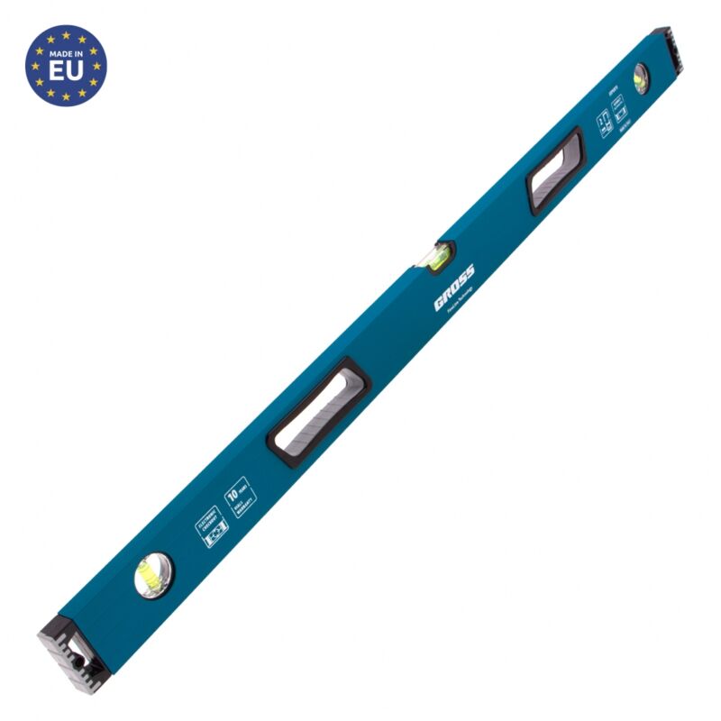 GROSS - Livello a 3 bolle in alluminio rinforzato, antiurto - 1000 mm Livello a bolla in alluminio rinforzato, tre assi di misura. Rivestimento in gomma assorbente agli urti. Il livello a bolla GROSS è un livello di qualità. Infatti, è realizzato in alluminio rinforzato, il che gli conferisce una grande solidità e durabilità. Dispone di parti strategicamente rivestite di gomma, che gli permettono di resistere agli urti e migliorare la presa in mano. È pensato e progettato per accompagnarti al meglio su tutti i tipi di cantieri/lavori. Prodotto in Europa, questo livello si presenta come un prodotto durevole. È in grado di misurare i livelli su 3 assi grazie alle sue 3 bolle diverse con una precisione elevata. Maniglie di presa Dispone di due maniglie per migliorare la presa e facilitare l'utilizzo. La sua dimensione di 100 cm è ideale per lavori di muratura e opere edili pesanti. Questo livello è progettato per un lavoro quotidiano dinamico su un cantiere edile! Caratteristiche
